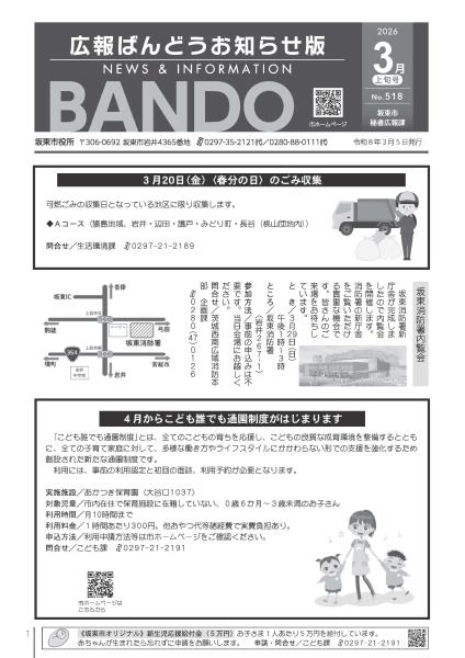 市では、行政情報や市の話題などを掲載する「広報ばんどう」を毎月第3木曜日、行事案内などを掲載する「広報ばんどうお知らせ版」を毎月第1・3木曜日に発行しています。自治組織に加入している方に、各地区の区長さん、班長さんを通して各家庭にお届けしているほか、次のとおり市ホームページにも掲載しています。